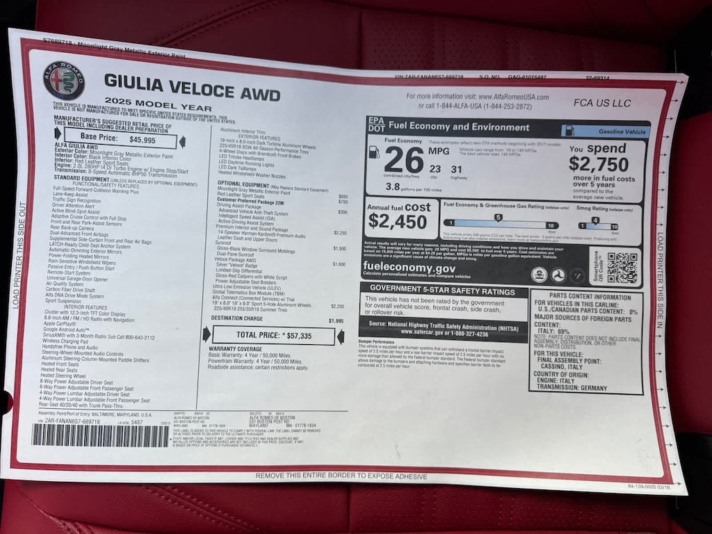 PREMIUM INTERIOR & SOUND PACKAGE 14 Speaker harman/kardon® Premium Audio, Leather Dash & Upper Doors, WHEELS: 19 X 8 FR/19 X 9 RR SPORT 5-HOLE ALUM Tires: 225/40R19 Fr & 255/35R19 Rr Summer, Summer/3-Season Tires, VELOCE PACKAGE AWD Power Adjustable Bolster, Gloss Red Calipers w/White Script, Limited Slip Differential Rear Axle, Silver Veloce Badge, BLACK, RED LEATHER SPORT SEATS, DRIVING ASSIST PACKAGE Active Driving Assist System, Thatcham Security Equipment, Intelligent Speed Assist (ISA).